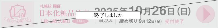 2025.9.12:レジャンデールコスメアカデミー札幌校主催、10月26日(日)検定及び対象講座受付を終了しました。尚。2025年度検定および講座の受付は全て終了しました。2026年度のスケジュールは現在調整中です。